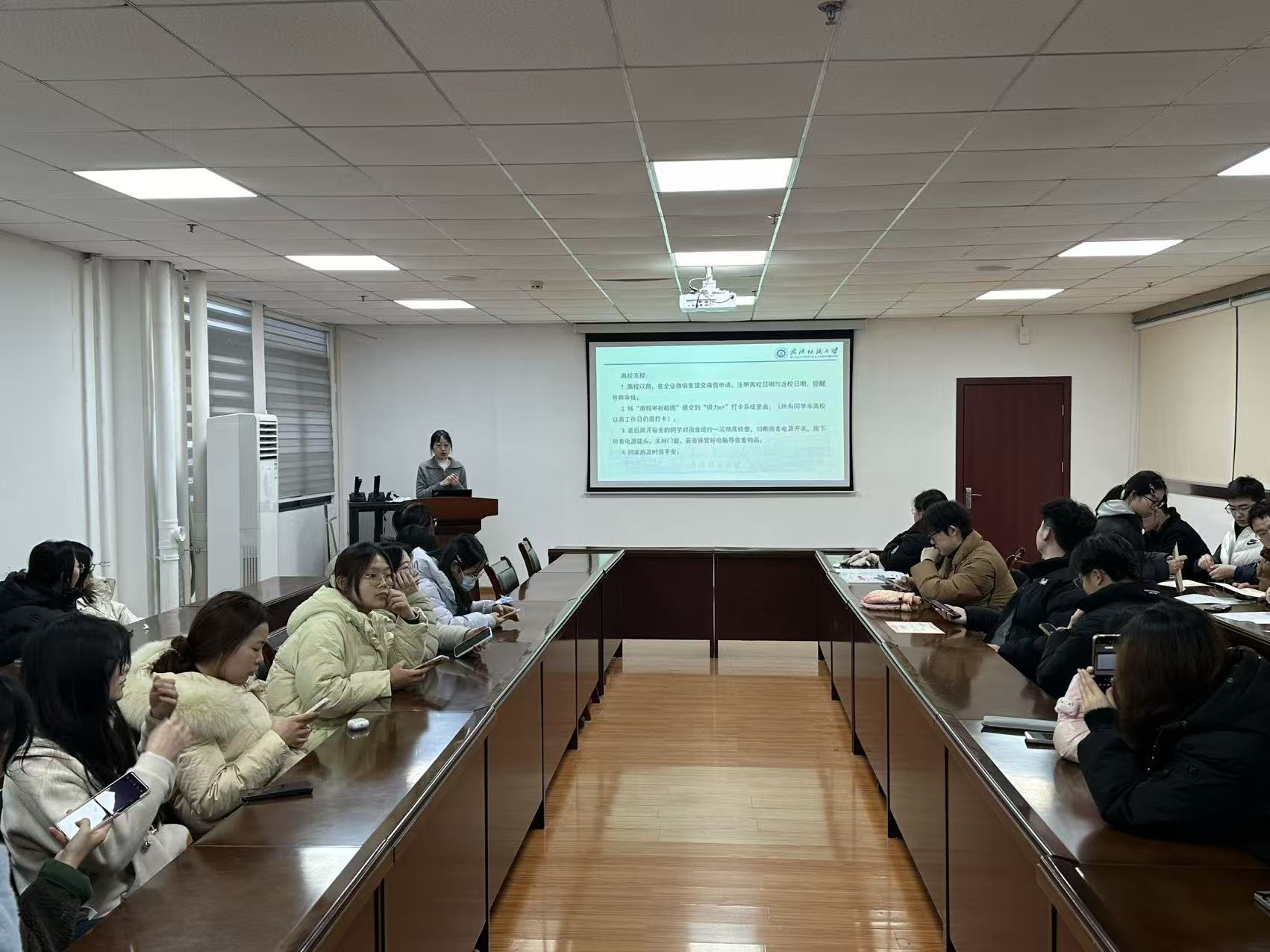 1月6日下午,生物医学工程与健康学院在崇真北楼B3004教室召开全体研究生寒假安全教育专题会议。研究生辅导员邓兰就寒假离校安排进行讲解,重点围绕宿舍与实验室安全、防范电信诈骗、交通出行安全及假期心理健康等内容开展系统教育,通过真实案例剖析和安全规范讲解,切实增强研究生安全防范意识。