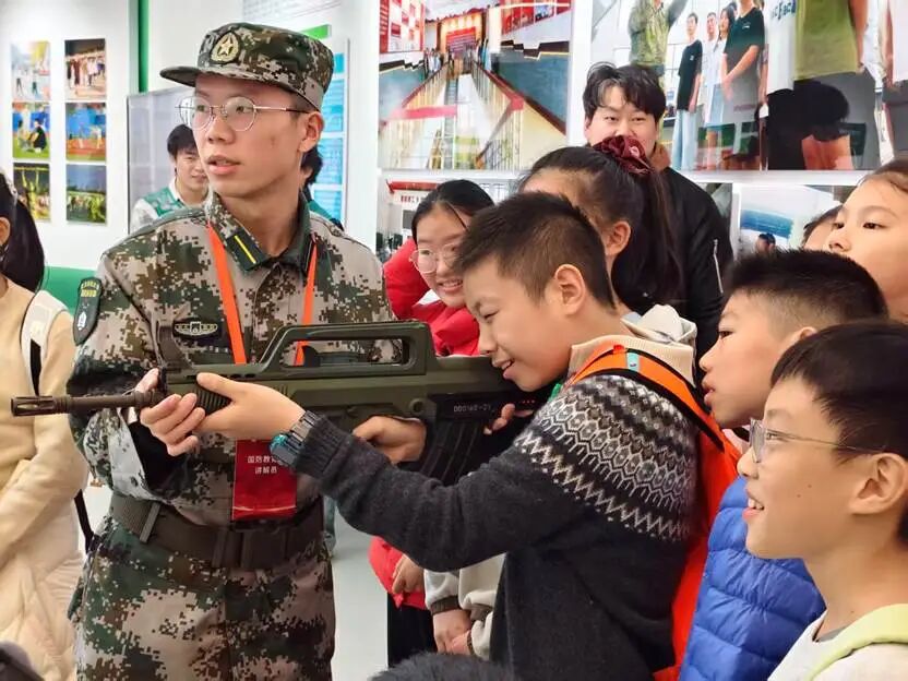 步入国防科技馆,国防科技主题展随即吸引了同学们的目光。在展区内,大家围绕展项认真聆听讲解,深入了解纺织材料在航天装备防护、军事防护装备等领域的创新应用;随后还迎来了模拟打靶与枪械认知的特别体验。“瞄准靶心,稳住呼吸——”在专业人员指导下,同学们神情专注,动作有模有样。这一环节不仅让同学们近距离感受到了国防科技的魅力,更在潜移默化中厚植了爱国情怀,增强了国防意识。