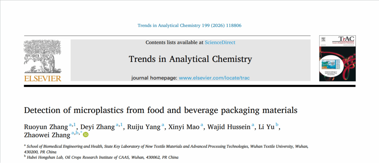 近日,在国家级大学生创新创业训练计划项目支持下,张兆威和张若筠等指导本院本科生张德翼,在本领域顶级期刊Trends in Analytical Chemistry发表题为Detection of microplastics from food and beverage packaging materials(//doi.org/10.1016/j.trac.2026.118806)的评述论文。该论文第一署名单位为武汉纺织大学,第一作者为张若筠,共一作者为张德翼,通讯作者为张兆威。